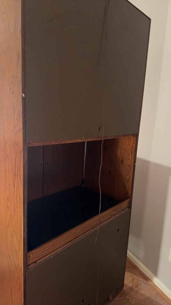 LIGHTED OAK COLORED WOODEN ARMOIRE. 78.5 inches tall, 36 inches wide 20 inches deep