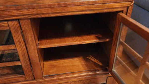 BEAUTIFUL TV STAND/CABINET WITH 3 SECTIONS AND GLASS FRONT DOORS, SOLID WOOD CONSTRUCTION WITH QUALITY DETAILING. LOTS OF STORAGE SPACE.