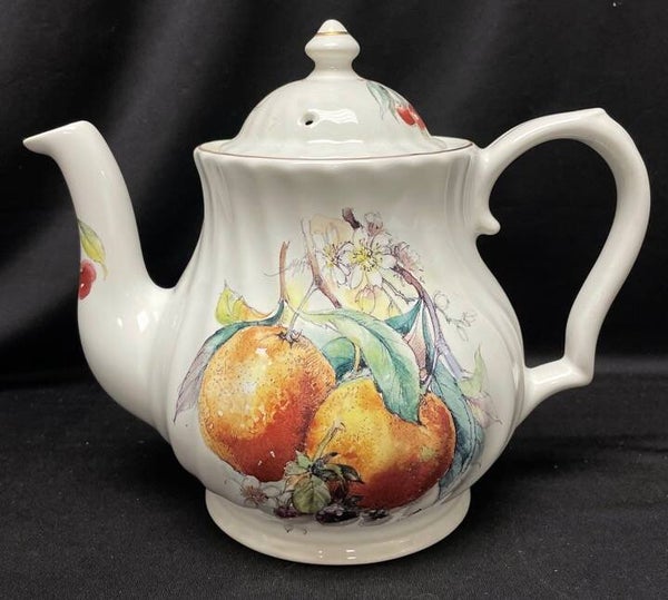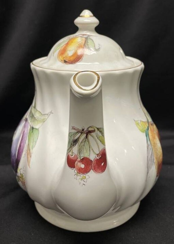 AMAZING PORCELAIN TEA POT WITH DIFFERENT FRUIT PAINTINGS OR LEFT AND RIGHT HAND SIDES.