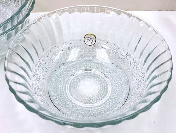 Set of three Crystal Clear Vintage Sandwich Pattern Glass Scalloped Dessert Bowls. 3" tall 7" wide.