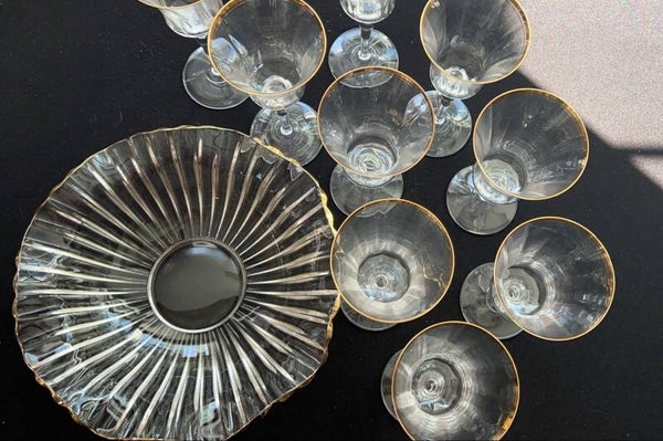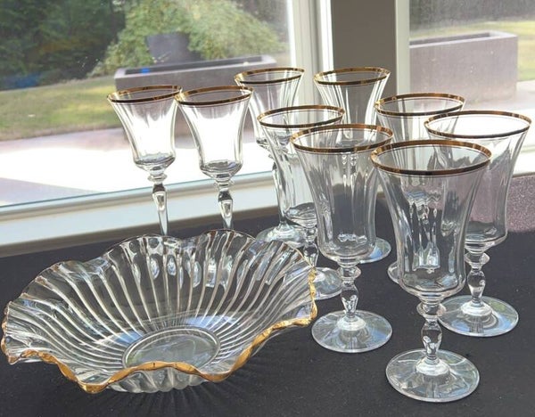 Mikasa's own Jamestown Serving bowl, a beautiful clear crystal/glass serving bowl with gold (color) trim. The goblet are sold as a set on our site as well.