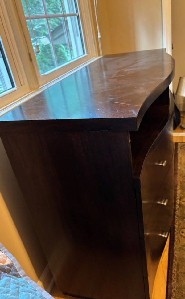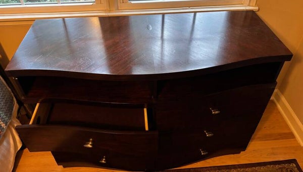 This chest of drawers is stained in dark wood and has a cute bowfront curve which makes it stand out. It has two open shelves at the top.